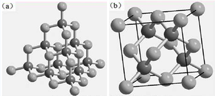 金剛石晶體中每個碳原子都以sp3雜化軌道與另外4個相鄰的碳原子形成共價鍵,每四個相鄰的碳原子均構(gòu)成正四面體(a),形成無限的三維網(wǎng)。四個正四面體為一個晶胞,晶體類型為立方面心(b)。金剛石中的C-C鍵很強,所有的價電子都參與了共價鍵的形成,沒有自由電子,所以金剛石硬度非常大,不導(dǎo)電,熔點在攝氏3800℃。金剛石在純氧中燃點為720~800℃,在空氣中為850~1000℃。室溫下不溶于任何酸和堿,高溫下不耐含氧酸鹽和強堿,一定溫度下與鐵、鈷、鎳、錳和鉑等金屬發(fā)生化學(xué)反應(yīng)。